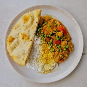 Gestoomde rijst I paprika I ui I tomaat I bloemkool I doperwt I naanbrood