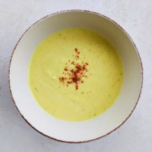 Heerlijk bereide bloemkool kerriesoep met verse ingrediënten.